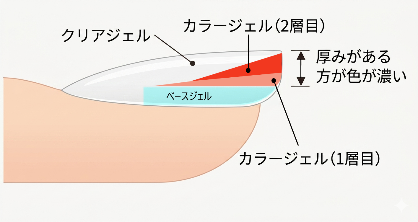 グラデーションを作る基本は、「先端から根元にかけてジェルの厚みを徐々に薄くしていく」ことです。